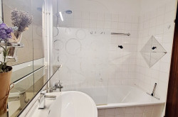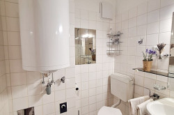 Das Schlafzimmer bietet ausreichend Platz und Rückzugsmöglichkeit. Das Badezimmer ist mit Badewanne, WC und Waschbecken ausgestattet; ein Waschmaschinenanschluss ist ebenfalls vorhanden.