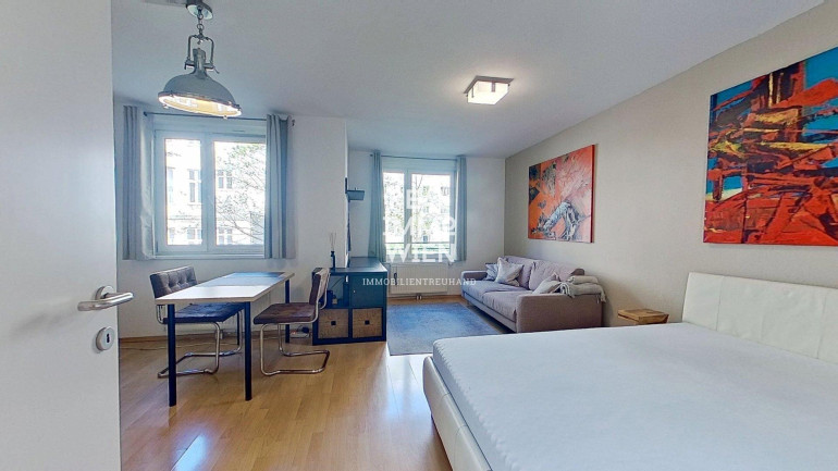 Die Immobilie besticht durch eine hochwertige sowie moderne Möblierung inklusive Designer-Stücken und ist sofort bezugsfertig. Das Studio-Layout auf 32 m² bietet eine voll ausgestattete Küche mit Geschirrspüler, große Fensterflächen für eine helle Atmosphäre und ein hochwertiges Interieur mit Bett und Sofa. Ein Einlagerungsraum ist vorhanden und im Haus gibt es eine Waschküche mit Waschmaschine und Trockner in den Allgemeinflächen. Die Beheizung erfolgt effizient über Fernwärme.