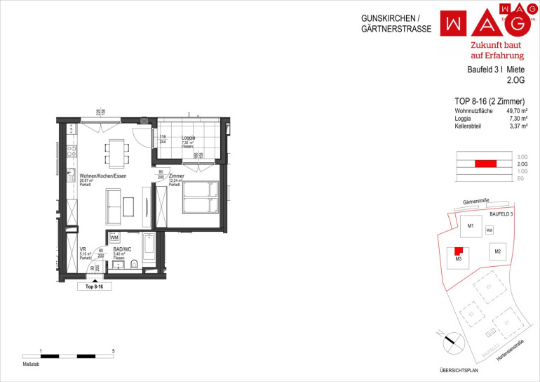 Am ehemaligen Sportplatz in der Gärtnerstraße in Gunskirchen errichtet die WAG drei moderne Wohngebäude mit insgesamt 60 geförderten Mietwohnungen und einer Tiefgarage mit 81 Stellplätzen. Die Anlage entsteht in nachhaltiger Hybridbauweise und bietet Wohnraum für unterschiedliche Lebenssituationen.