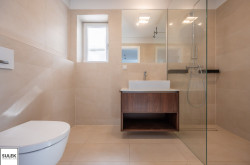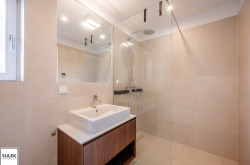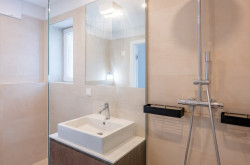- Badezimmer mit offener Duschkabine, Handwaschbecken, WC
