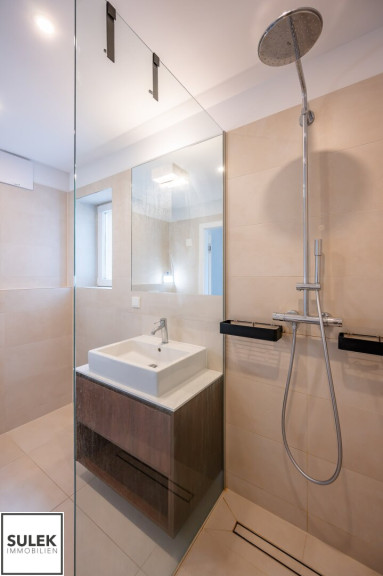 Fliesen, Parkettboden, Gas, Etagenheizung, Einbauküche, Wohnküche / offene Küche, Personenaufzug, Dusche, Bad mit Fenster