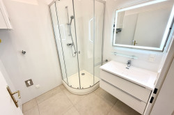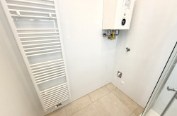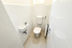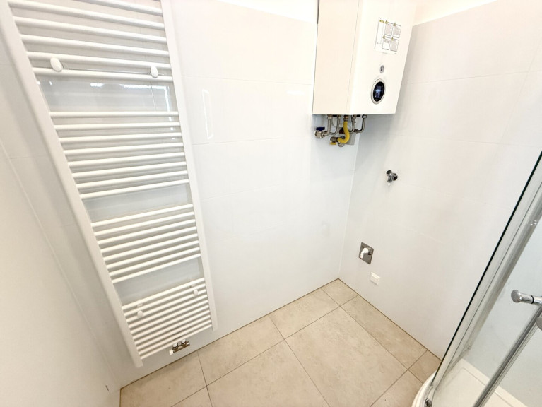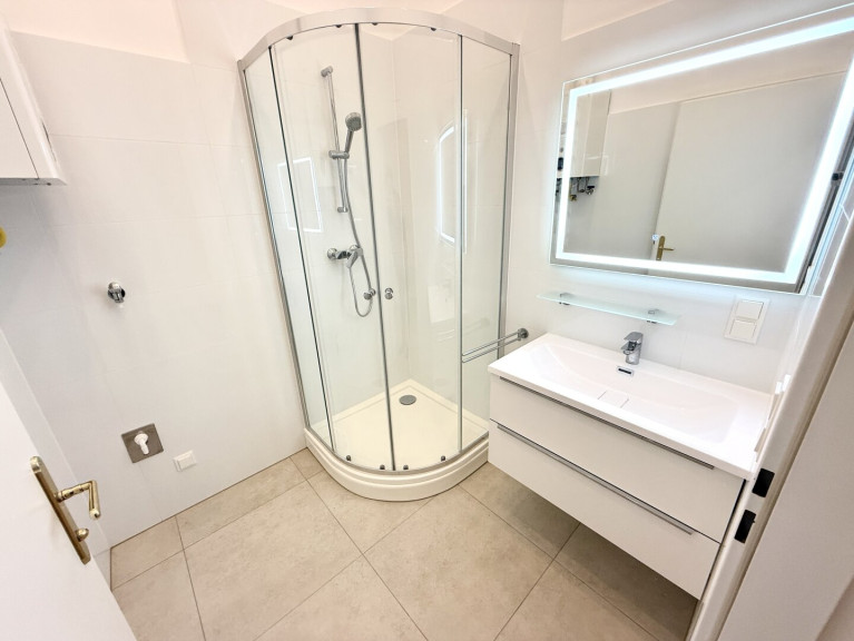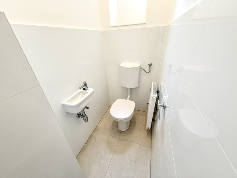 Das geräumige Badezimmer bietet eine moderne Dusche, ein Handwaschbecken, eine Handtuchheizung sowie einen Waschmaschinenanschluss. Das separate WC ist mit einem Handwaschbecken und einem Fenster zur Belüftung ausgestattet.