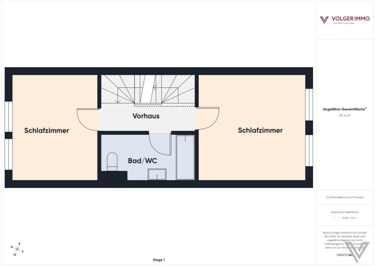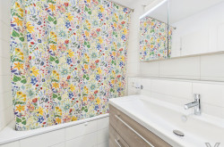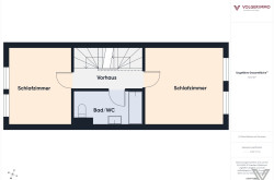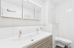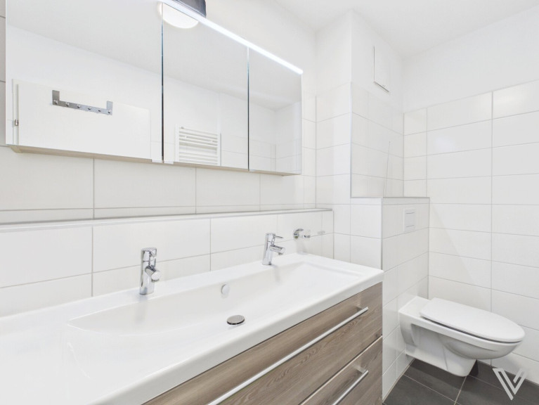 Obergeschoß: 2 Schlafzimmer, Bad mit Doppel-Waschtisch, Badewanne, Handtuchtrockner und WC;
