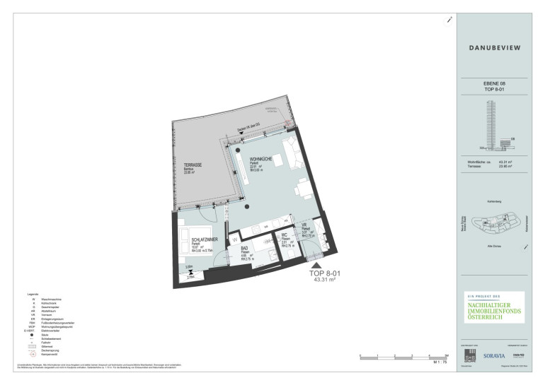Die Lage an der Neuen Donau vereint Natur, Urbanität und internationale Atmosphäre. Nur wenige Schritte trennen Sie von der U1-Station Donauinsel, mit der Sie in zehn Minuten im Herzen Wiens sind. Der Flughafen Schwechat ist rasch erreichbar, ebenso das nahegelegene Donauzentrum mit seinen zahlreichen Einkaufsmöglichkeiten. Ein bilingualer Kindergarten, Volksschule und Gymnasium befinden sich in Gehweite, ebenso wie Nahversorger, Ärzte und gastronomische Angebote. DANUBEVIEW liegt direkt an der Neuen Donau – perfekt für Sport, Freizeit und Erholung. Ob Laufen, Radfahren oder Schwimmen: Hier wird das Wasser zum täglichen Begleiter und die Umgebung zur persönlichen Wohlfühlzone.Beschreibung der Immobilie