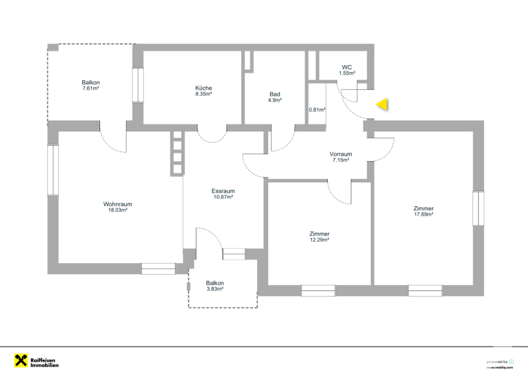 Diese 3-Zimmerwohnung umfasst ein großes und ein kleineres Schlafzimmer, ein Badezimmer und ein separates WC. Der große und sonnige Wohnessbereich mit direktem Zugang zu den süd- und ostseitig ausgerichteten Balkonen bietet einen angenehmen Wohnkomfort und viel Platz.
