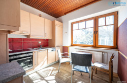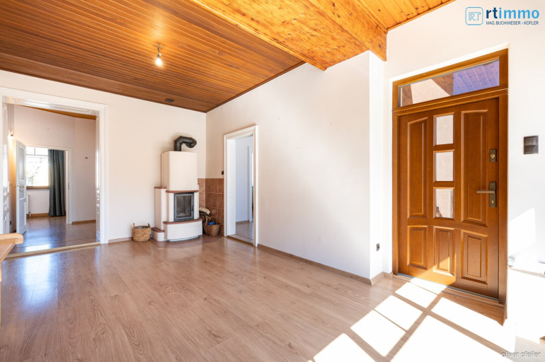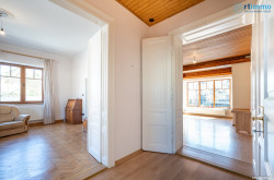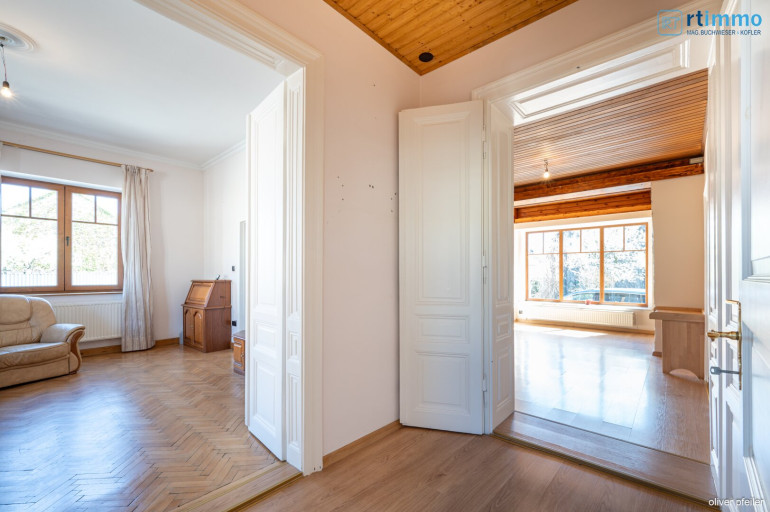 Das Erdgeschoss besteht aus einem Vorraum, Küche, Wohnzimmer, einem kleineren Zimmer (ehemalige Bibliothek), einem großen Eckzimmer, einem Schlafzimmer mit einer großen begehbaren Garderobe. Weiters gibt es auch eine Dusche und eine südwestlich gerichtete große überdachte Terrasse.
