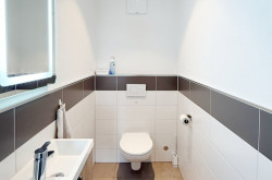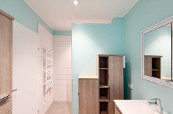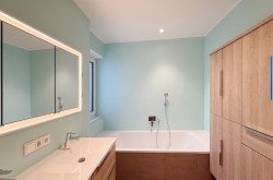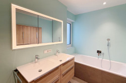 - Das Badezimmer ist mit Wanne, Dusche, 2 Waschbecken, Handtuchwärmer, versenktem Spiegelschrank und Badmöbeln komplett ausgestattet