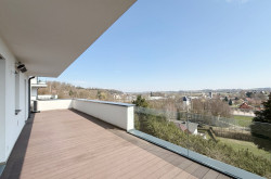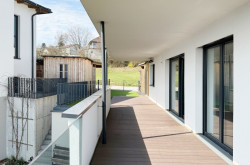 Die Terrasse erstreckt sich über die gesamte Ost- und Südseite der Wohnung und ist teilweise überdacht. Hier lässt sich immer ein gemütliches Sonnen- oder Schatten-Plätzchen für entspannte Stunden finden.