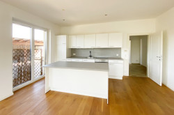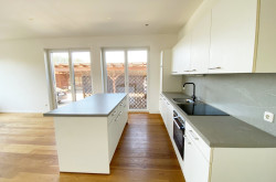 Die Wohnküche ist mit 36,67 m² sehr großzügig geschnitten und mit einer zeitlosen Küche mit Kochinsel eingerichtet.