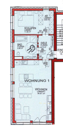 Raumaufteilung: Wohnküche, Schlafzimmer, Bad/WC, Diele