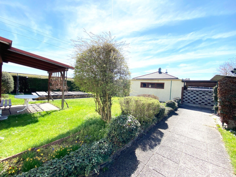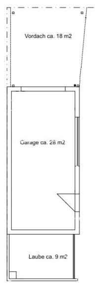 Die Garage befindet sich direkt an der Grundstücksgrenze. Durch ein großes Vordach wurde ein Carport geschaffen, der Platz für ein zweites Fahrzeug bietet.