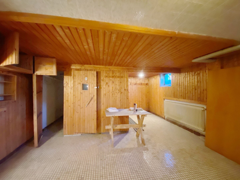 Das Gebäude ist großteils unterkellert. Der Zugang ist sowohl vom Vorraum als auch direkt vom Garten möglich. Im Keller befindet sich neben den üblichen Lager- und Technikräumen auch eine Sauna.