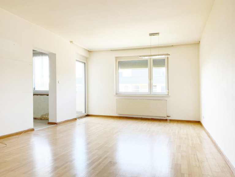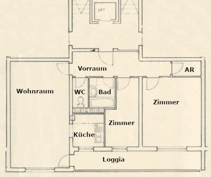 Raumaufteilung: Küche, großes Wohnzimmer mit Loggia, Schlafzimmer, Kinderzimmer, Bad mit Wanne, WC, Abstellraum, Vorraum