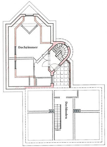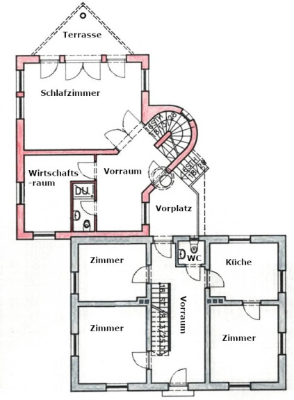 Die beiden Bauteile haben getrennte Eingänge und sind derzeit nur im Obergeschoss und im Dachgeschoss (nur der Zubau ist ausgebaut) direkt verbunden.
