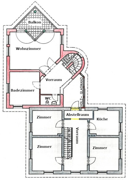 OG: Zimmer mit Balkon, Bad mit Wanne und Dusche, WC, Diele mit Zugang zum "Altbau" und damit zur Küche und weiteren 3 Zimmern