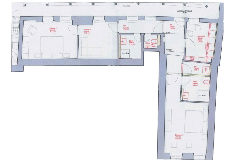 Raumaufteilung: Küche, 3 Zimmer, Abstellraum, Bad/WC, Bad, WC, Vorraum
