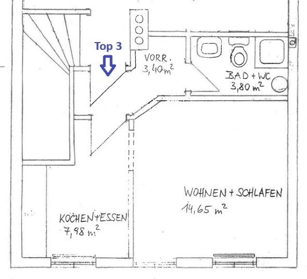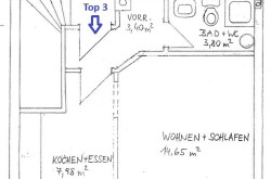 Raumaufteilung: Küche, Wohn-/Schlafzimmer, Bad mit Dusche und WC, Vorraum