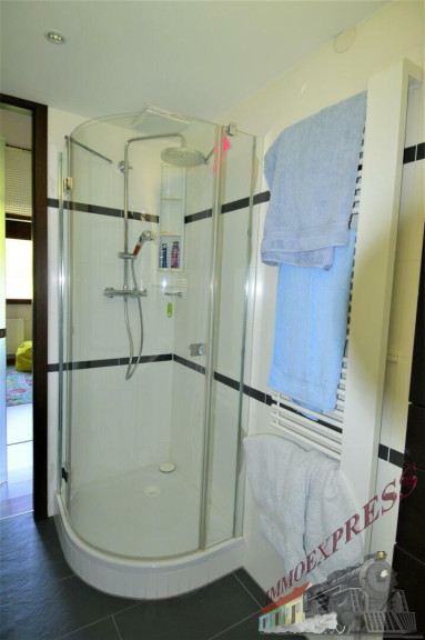 - Badezimmer mit Dusche - Waschbecken - Handtuchheizkörper und Fenster