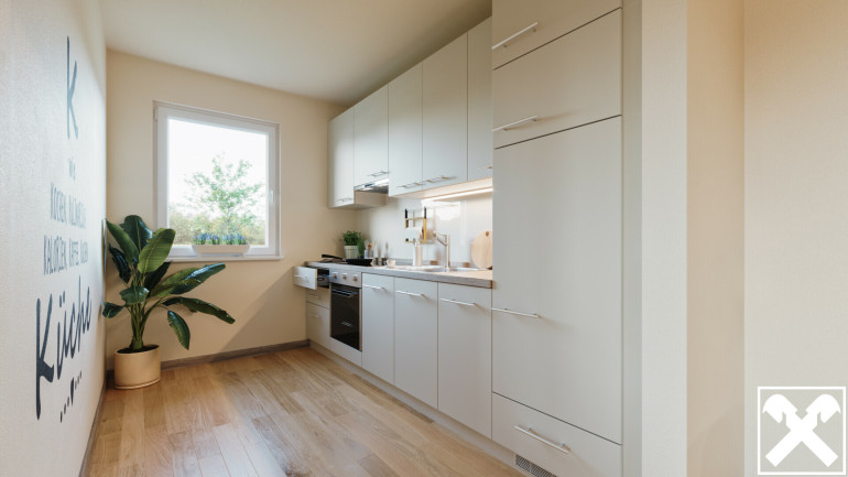 - inkl. moderner Einbauküche samt E-Geräte (Herd, Backofen, Kühlschrank mit Gefrierfach, Geschirrspüler, Dunstabzug)