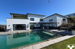 Zwei großzügige Terrassen bieten ideale Möglichkeiten, die Sonne zu genießen und den Außenbereich voll auszukosten. Ein besonderes Highlight ist der große Schwimmteich, der eine idyllische Atmosphäre schafft und zum Erholen einlädt.