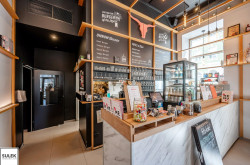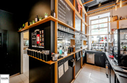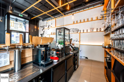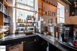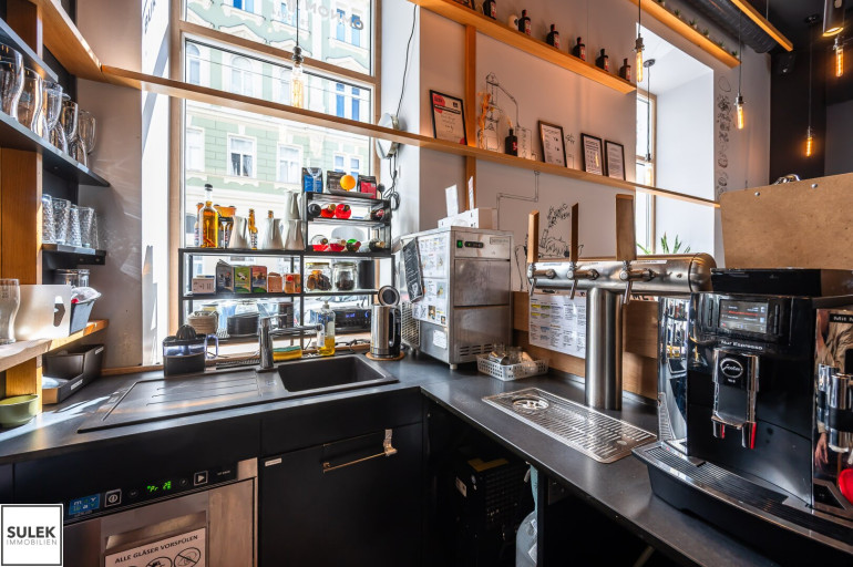 - Verkaufsbereich mit Kühl-Theke (6 Getränke Schubladen), Registrierkasse von TIPOS mit Schnittstelle zu Lieferdienst Foodora, Dessertvitrine, Schankanlage für 2x 20L Fassbier und Soda, Kaffeevollautomat von Jura, Eiswürfelmaschine, Gastro-Gläserspüler & Musik-Anlage mit Lautsprechern