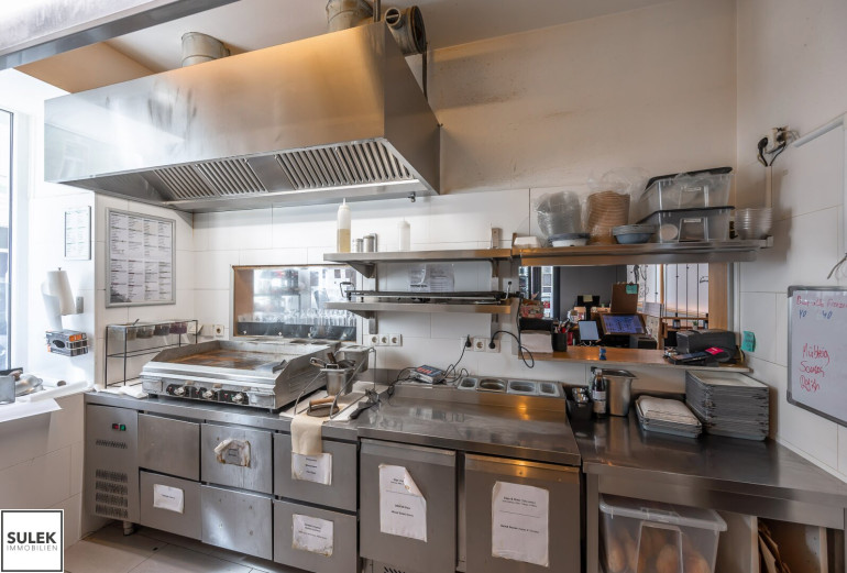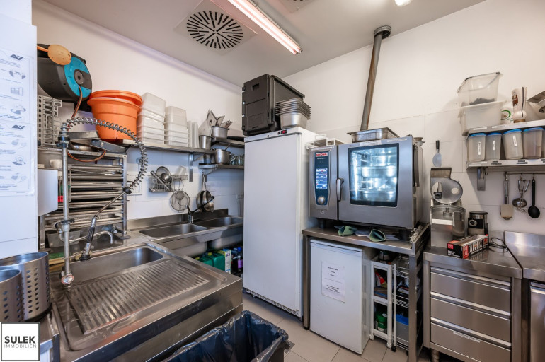 - Getrennte Gastro-Küche mit Durchreiche und Blick in den Gastraum, vollausgestattet mit Starkstrom Elektro Griller, moderner Tisch-Fritteuse, Profi Kombidämpfer von Rational, 4 Gastro-Kühltische mit Türen und Laden, Gastro-Geschirrspüler, 2 Spültische, Gemüseschneider, Pommesschneider, Tiefkühlschrank, Aufschnittmaschine und diverse andere Geräte