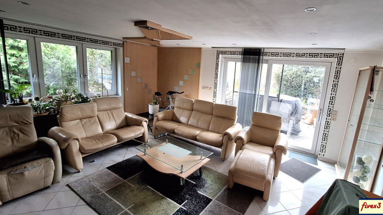 + Helles Wohnzimmer mit großen Glasflächen und Terrassenschiebetür