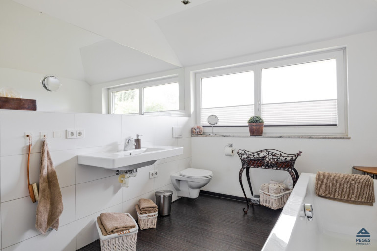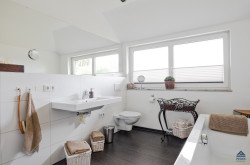 Die beiden Zimmer sind mit schönen Parkettböden ausgestattet. Elegant und modern präsentiert sich auch das taghelle Bad, das mit einer bodengleichen, geräumigen Dusche sowie Badewanne und einem WC ausgestattet ist (ein eigener Waschmaschinen-Anschluss befindet sich im Keller). Das Gäste-WC ist separat angeordnet. Ein großzügiger Keller-/ Hobbyraum mit ca. 27,97 m² im Untergeschoss bietet viel Stauraum und vielfältige Nutzungsmöglichkeiten.