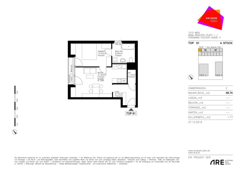CITYNAH UND MITTEN IM GRÜNEN Die Wohnungen befinden sich am autofreien Areal des Projektes AM PARK auf den sogenannten “Siemensäckern”. Die Naherholungsgebiete der Alten Donau sind mit dem Rad und öffentlichen Verkehrsmitteln in rund 15 Minuten erreichbar. Die “Siemensäcker” liegen in der Nähe der S-Bahn-Station Siemensstraße. Das Areal wird mit der Buslinie 28A künftig gut angebunden. Die S-Bahn-Stationen Siemensstraße und Floridsdorf sind so innerhalb kürzester Zeit erreichbar. Weitere öffentliche Verbindungen sind mit den Buslinien 31A und 29A gegeben.Beschreibung der Immobilie