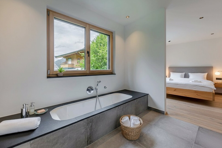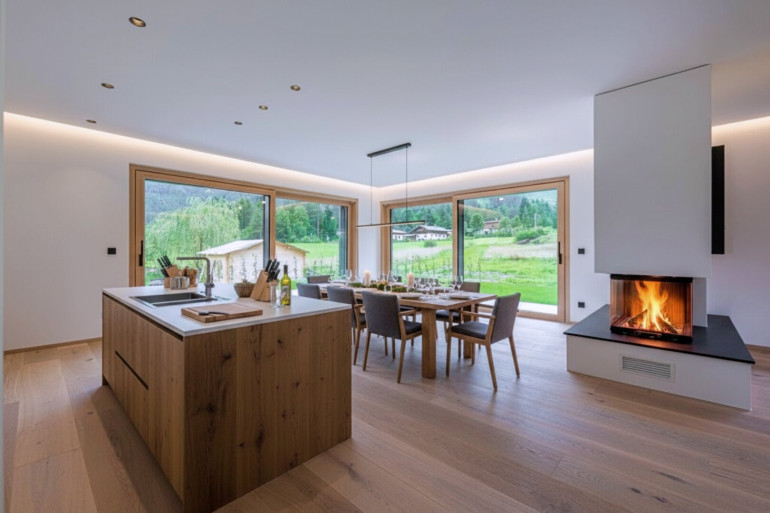 Wohnung Top 4: 4-Zimmer Gartenwohnung. Die Wohnung befindet sich im 1. Obergeschoss und verfügt über einen großzügigen Garten in Südwest-Lage. Über einen Vorraum mit Platz für die Garderobe kommen Sie in die großzügige und lichtdurchflutete Wohnküche mit großen Fenster-Elementen, indirekter Beleuchtung, hochwertigem Glaskamin und Zugang zur Terrasse. Alle Anschlüsse für eine hochwertige Küche mit Kochinsel sind vorhanden. Zudem verfügt die Wohnung über ein großzügiges Masterschlafzimmer mit Bad en Suite, welches über eine Regenduschbrause und eine große Badewanne verfügt. Des Weiteren gibt es zwei Schlafzimmer, die sich ein gemeinsames Badezimmer teilen. Ein Gäste-WC und ein Hauswirtschaftsraum mit Anschlüssen für Waschmaschine und Trockner komplettieren das Angebot.