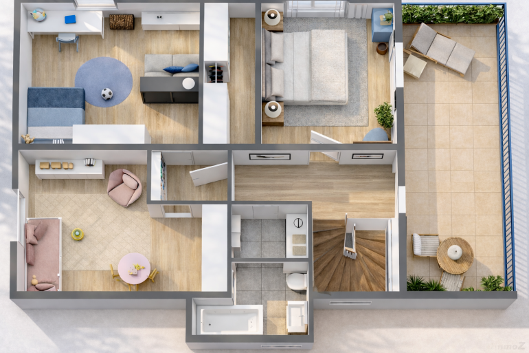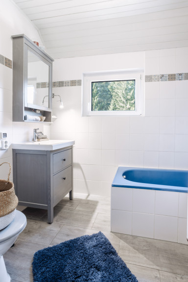 Im Obergeschoss befinden sich ein lichtdurchflutetes Schlafzimmer mit begehbarem Schrankraum, zwei Kinderzimmer, ein Badezimmer mit Badewanne und WC sowie ein überdachter Balkon mit schönem Blick ins Grüne.