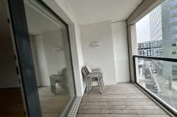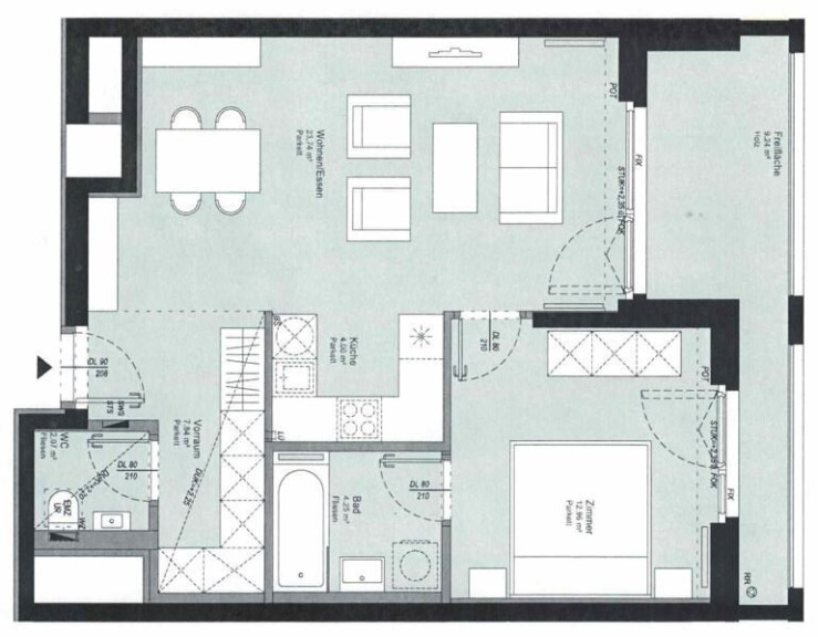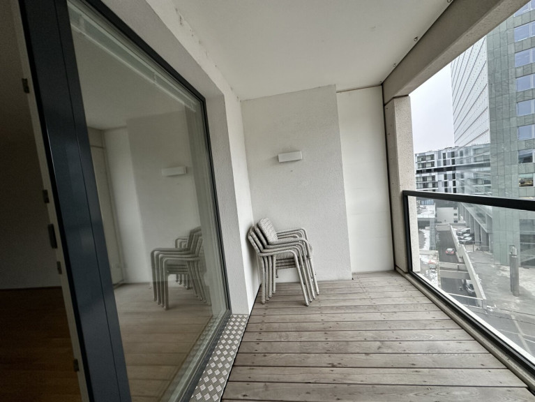 Die Wohnung hat raumhohe dreifach-verglaste Fenster, sowie eine vorgelagerte Freifläche / Loggia mit südwestlicher Ausrichtung mit ca. 10 m2 Freifläche, die von jedem Zimmer aus begehbar ist. Licht, Steckdosen und Wasseranschluss vorhanden.