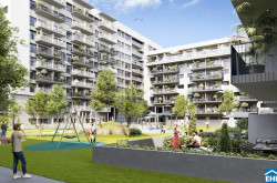 Im Erdgeschoss laden weitläufige Grünflächen sowie attraktiv gestaltete „Wohnstraßen“ mit Sitzmöglichkeiten zum Verweilen und Entspannen ein. Ergänzend dazu entsteht im östlichen Teil des Areals eine öffentlich zugängliche Parkanlage.