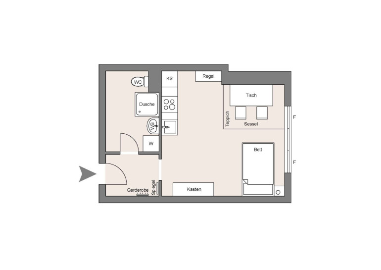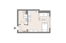 29m², Einbauküche mit Kühlschrank, E-Herd und Dunstabzugshaube, Zimmer mit Bett, Kleiderschrank, Tisch und Sessel, Regal, Bad mit Dusche und WC, Waschmaschine, WLAN.