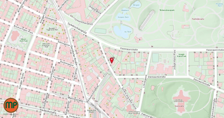 Unweit des Türkenschanzparks mit ausgezeichneter Anbindung via Knotenpunkt Gersthof (S45, 9, 40, 41, 10A, 42A); mit dem Auto über die B222 bestens ans Wiener Straßennetz angebunden.