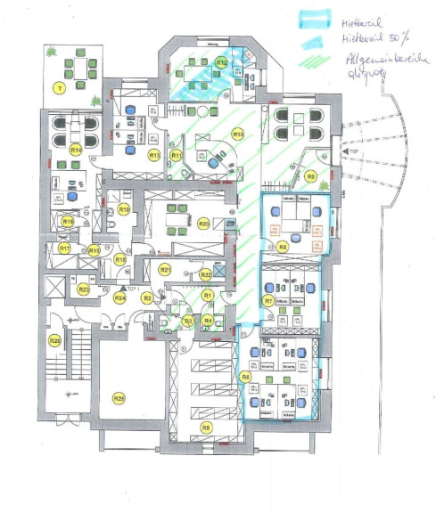 - 100,36 m² Allgemeinbereiche (Empfang, Wartebereich, Teeküche, Sanitärbereiche) aliquot aufgteteilt