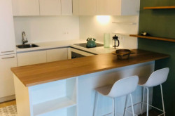 - eine modern und voll ausgestattete Wohnküche mit Barelement und Barhockern, Esstisch mit Sesseln sowie Ausgang auf die Loggia