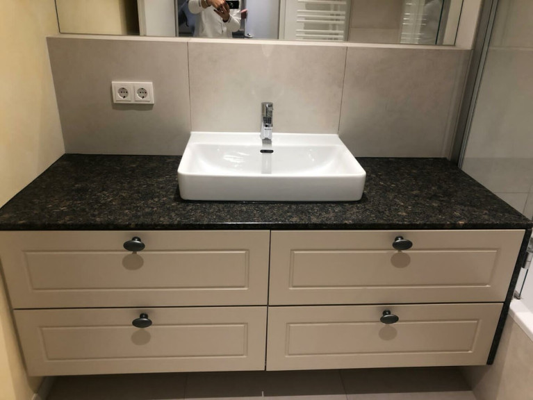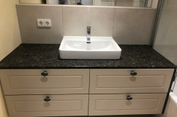- ein Badezimmer mit Waschtisch, Unterschrank mit 4 Laden, Badewanne, Spots und Spiegel