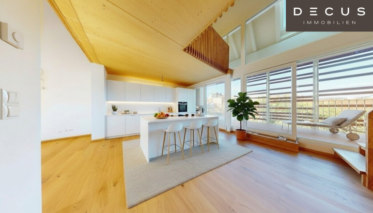 Highlights: Privater Lift, große Terrassen, offener Wohnbereich, zwei Badezimmer + Gäste-WC, Galerie als Rückzugsort, moderne Infrastruktur und grüne Freiflächen.