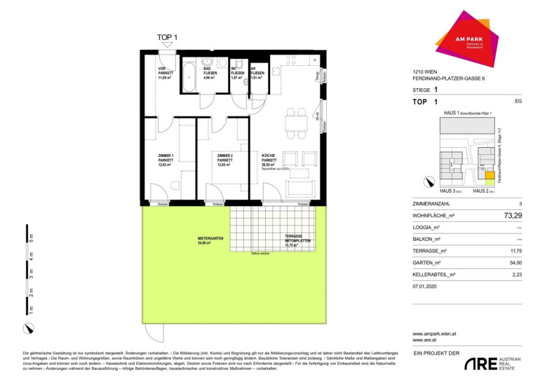 CITYNAH UND MITTEN IM GRÜNEN Die Wohnungen befinden sich am autofreien Areal des Projektes AM PARK auf den sogenannten “Siemensäckern”. Die Naherholungsgebiete der Alten Donau sind mit dem Rad und öffentlichen Verkehrsmitteln in rund 15 Minuten erreichbar. Die “Siemensäcker” liegen in der Nähe der S-Bahn-Station Siemensstraße. Das Areal wird mit der Buslinie 28A künftig gut angebunden. Die S-Bahn-Stationen Siemensstraße und Floridsdorf sind so innerhalb kürzester Zeit erreichbar. Weitere öffentliche Verbindungen sind mit den Buslinien 31A und 29A gegeben.Beschreibung der Immobilie