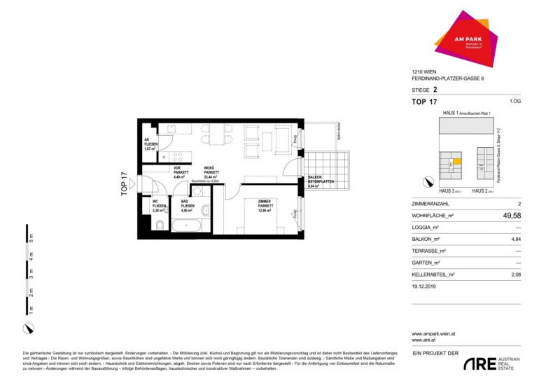 CITYNAH UND MITTEN IM GRÜNEN Die Wohnungen befinden sich am autofreien Areal des Projektes AM PARK auf den sogenannten “Siemensäckern”. Die Naherholungsgebiete der Alten Donau sind mit dem Rad und öffentlichen Verkehrsmitteln in rund 15 Minuten erreichbar. Die “Siemensäcker” liegen in der Nähe der S-Bahn-Station Siemensstraße. Das Areal wird mit der Buslinie 28A künftig gut angebunden. Die S-Bahn-Stationen Siemensstraße und Floridsdorf sind so innerhalb kürzester Zeit erreichbar. Weitere öffentliche Verbindungen sind mit den Buslinien 31A und 29A gegeben.Beschreibung der Immobilie