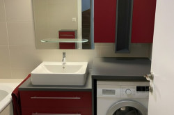 - Badezimmer: Badewanne, Einbaumöbel, Waschbecken mit Armaturen von Ideal, Waschmaschinenanschluss, Handtuchtrockner, Elektro-Fußbodenheizung zusätzlich, Fliesen, Spiegel