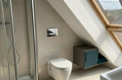 - Bad: Dusche, WC, Einbaumöbel von Peter Max, Waschbecken mit Armaturen von Ideal, zusätzlich Elektro-Fußbodenheizung