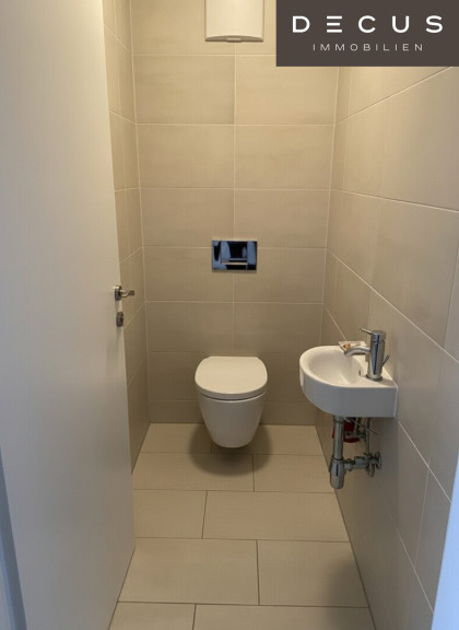 Das Badezimmer ist hochwertig ausgestattet mit Badewanne, Einbaumöbeln, Waschbecken mit Armaturen von Ideal, Handtuchtrockner sowie zusätzlicher elektrischer Fußbodenheizung. Ein Waschmaschinenanschluss ist vorhanden. Das WC ist separat und ebenfalls mit Markenarmaturen ausgestattet.