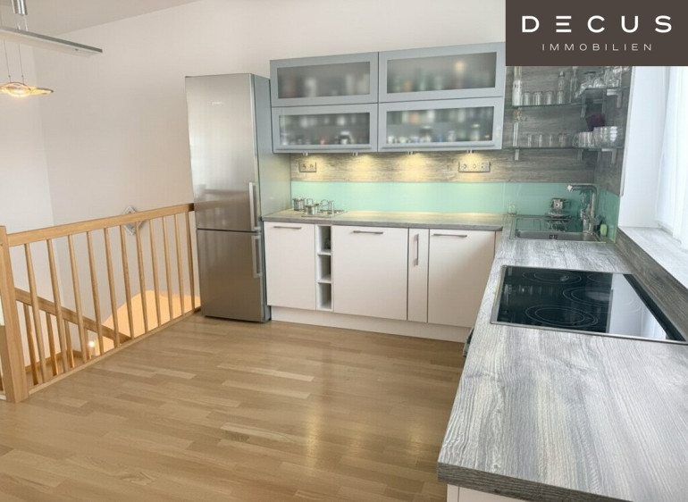 Die obere Ebene präsentiert sich als offener Wohnbereich mit integrierter Küche. Die Einbauküche ist mit Siemens-Geräten (Geschirrspüler, Backofen, Ceranfeld) sowie Armaturen von Blanco ausgestattet.