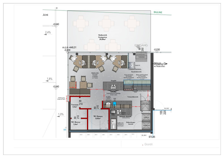 Das direkt an der Hauptstraße in dem modernen Neubauprojekt Anima Mea gelegene Geschäftslokal eignet sich bestens sowohl für ein gemütliches Bar-Caffe' Konzept als auch für zeitgemäße moderne Büro- oder Geschäftsräumlichkeiten mit zusätzlichen Ausstellung- und Aufenthaltsflächen im Freien.