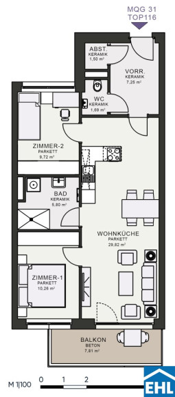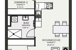 Fliesen, Parkett, Fußbodenheizung, Wohnküche / offene Küche, Personenaufzug, Dusche