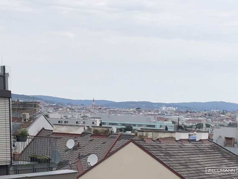 Aus dem zentralen Vorraum mit Pantryküche gelangt man sowohl in das exquisite Badezimmer mit Dusche und WC, als ich in den gemütlichen Wohn- Schlafbereich. Aus den Dachfenstern hat man ebenso einen wunderbaren Blick über Wien und die Wiener Hausberge.