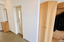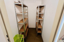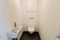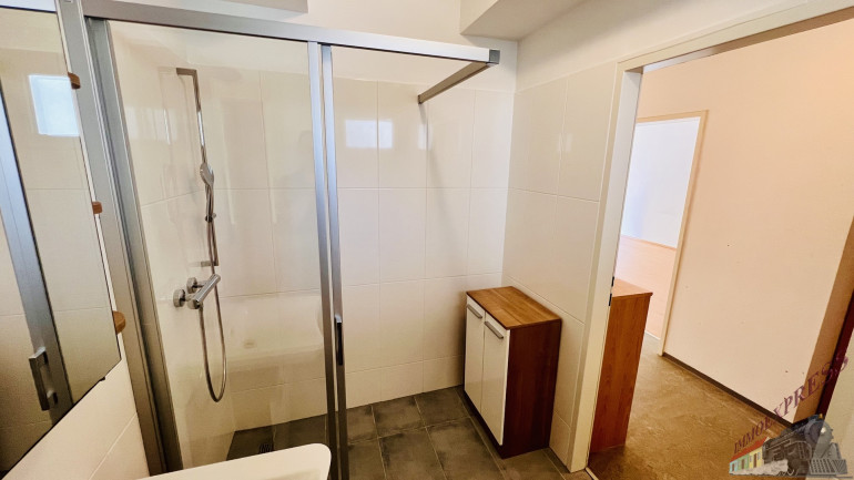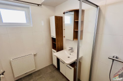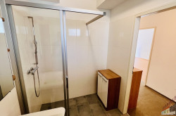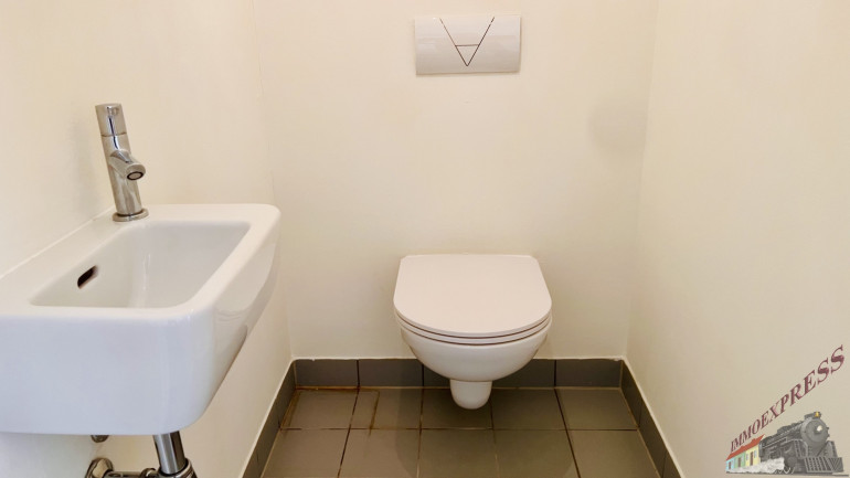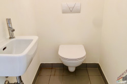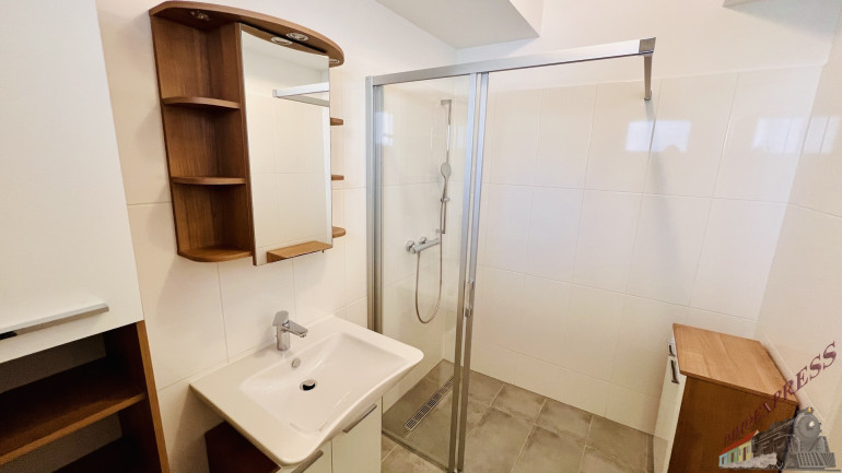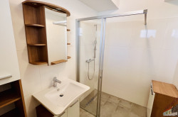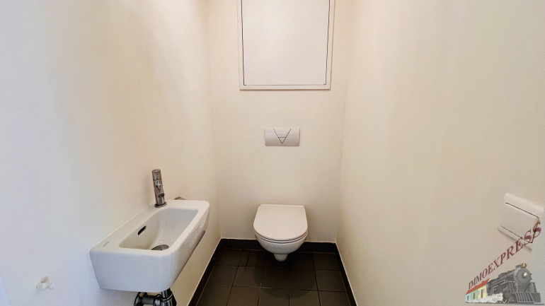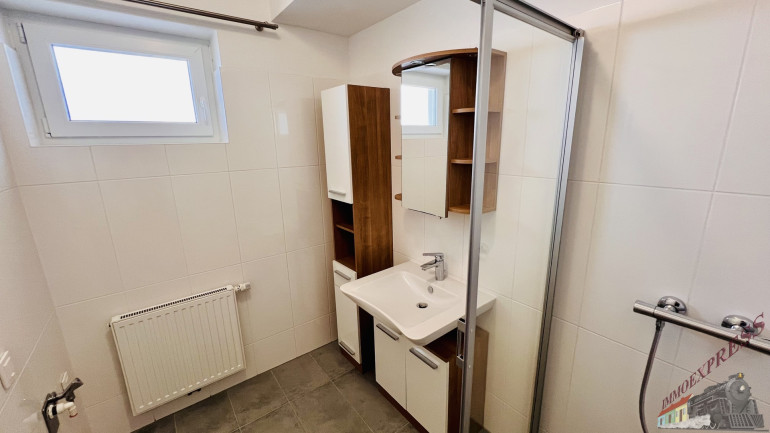 Zur Linken Hand befinden sich das Badezimmer mit der Walk-In-Dusche, einem Fenster und dem WM-Anschluss, das separate WC mit Handwaschbecken, sowie ein geräumiger Abstellraum.