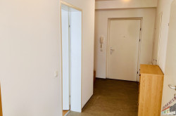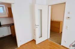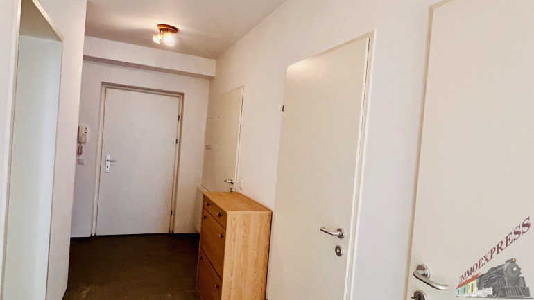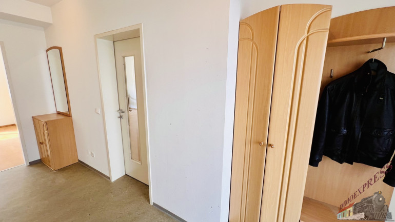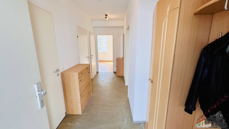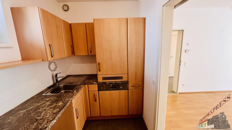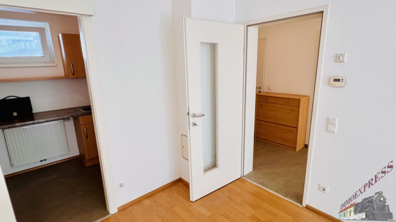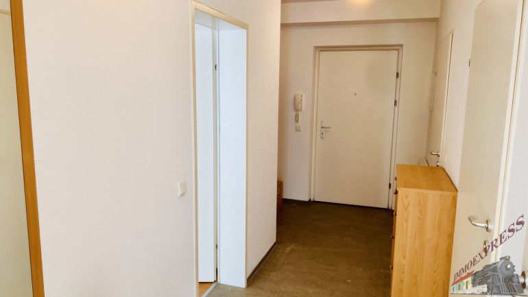 Vom Eingangsbereich mit viel Platz für Ihre Garderobe gelangen Sie rechterhand einerseits in den großzügigen Wohn-/Essbereich mit Zugang zum Balkon (ca. 8 m²) und der vollausgestatteten Einbauküche (abtrennbar mittels einer Schiebetüre) mit insgesamt ca. 32 m².